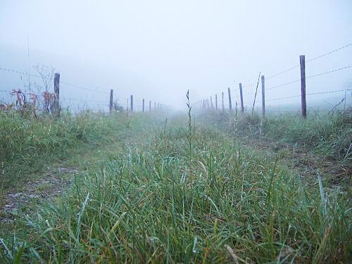 Die effektive Sichtweite beträgt nur etwa 50 m. Das Ende des Feldweges verschwindet im Dunst.