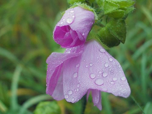 Letzte, spät blühende Blumen, zeigen ihre Blüten - Tautropfenbehangen.
