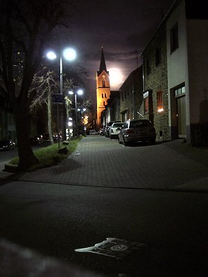 Aufnahme mit dem "Nachtprogramm". Angestrahlter Kirchturm mit Vollmond im Hintergrund und Straßenlaternen. |